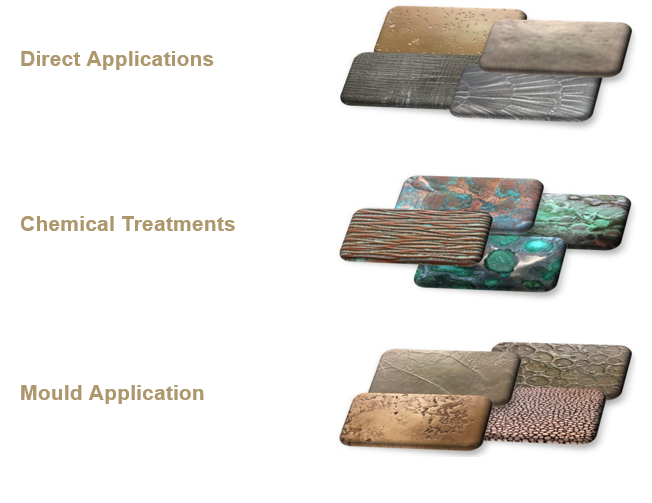 All conceivable design variants and metal mixtures are available for the liquid metal coating for designs in bright gold bronze, brass, copper to silvery aluminum and steel.